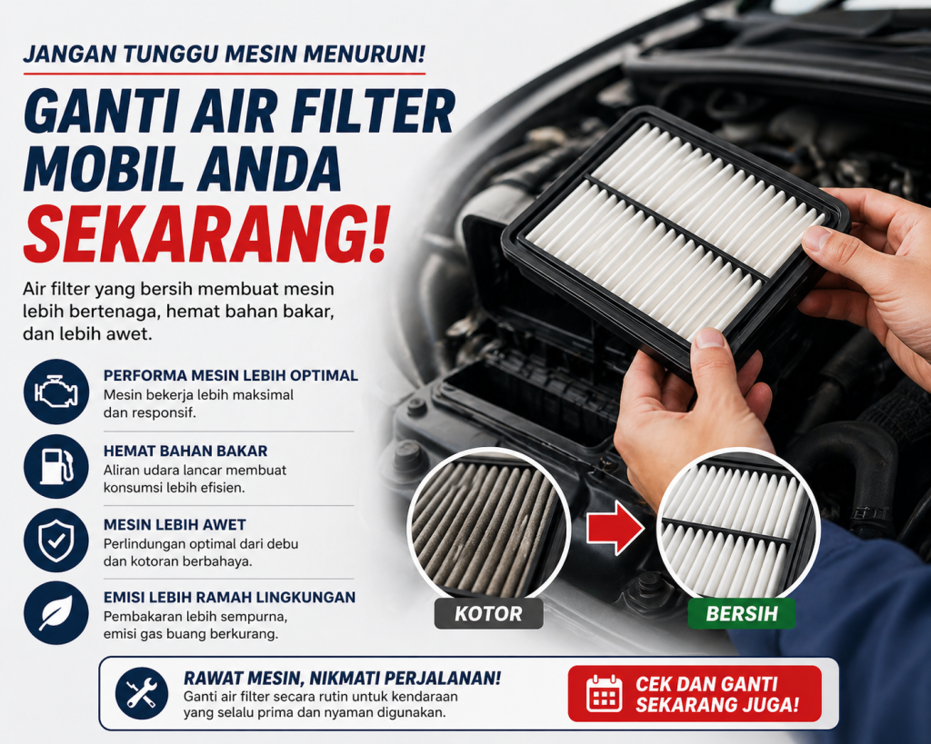 Air filter mobil merupakan salah satu komponen penting dalam sistem mesin yang berfungsi menyaring udara sebelum masuk ke ruang pembakaran. Udara yang masuk ke mesin harus bersih dari debu, kotoran, dan partikel lainnya agar proses pembakaran berjalan optimal. Oleh karena itu, kondisi air filter sangat berpengaruh terhadap performa dan efisiensi kendaraan.