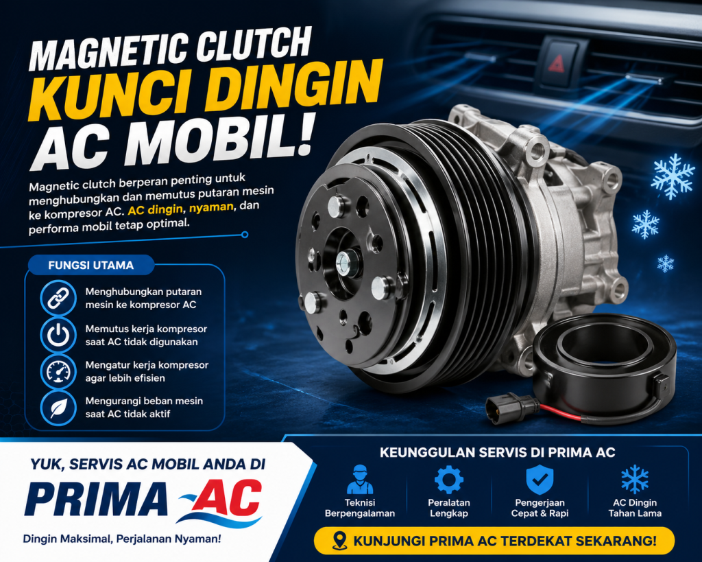 Yuk, pastikan AC mobil tetap dingin dan nyaman! Oleh karena itu, segera cek magnetic clutch dan lakukan servis AC mobil Anda di Prima AC sekarang juga agar performanya tetap optimal.