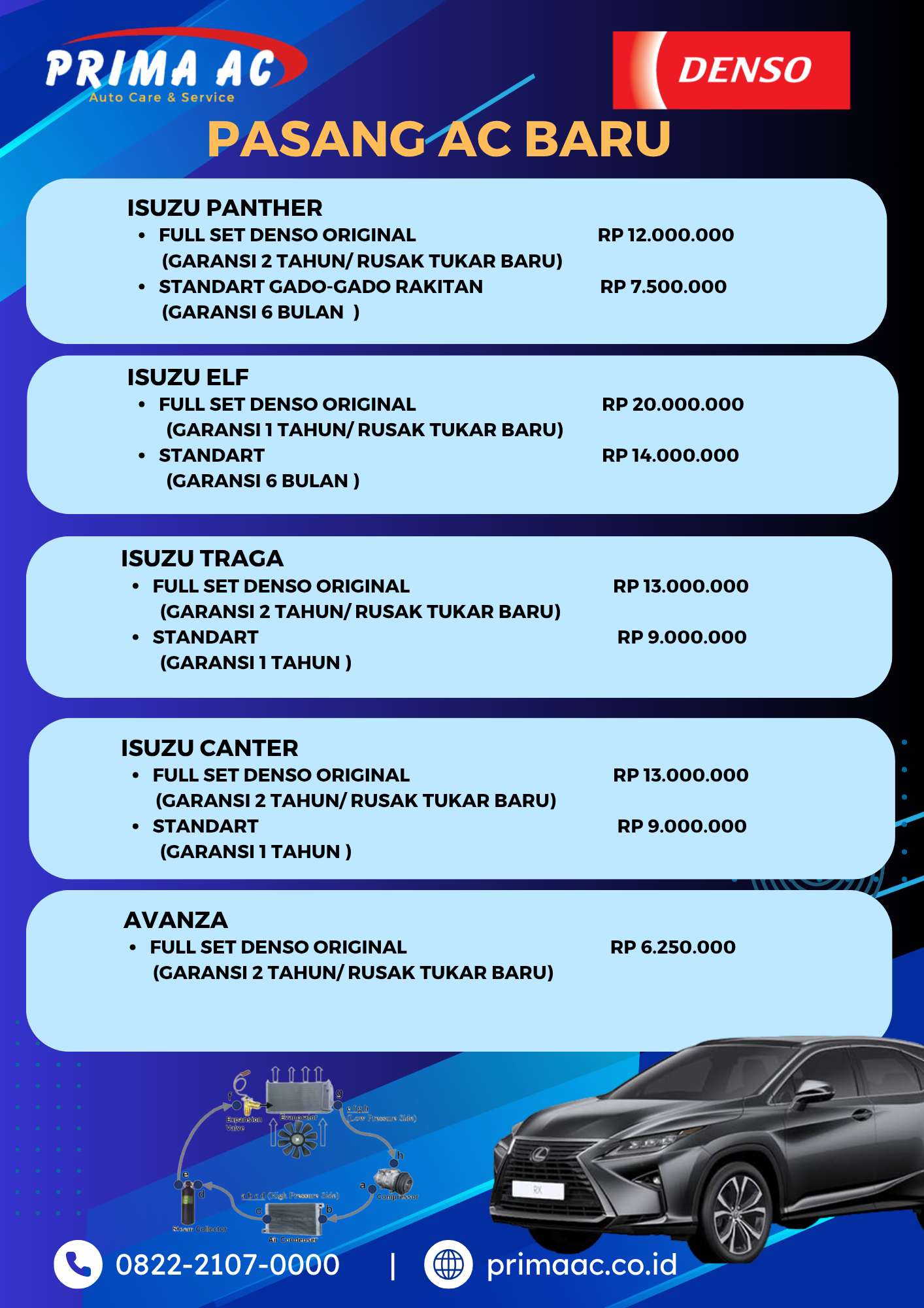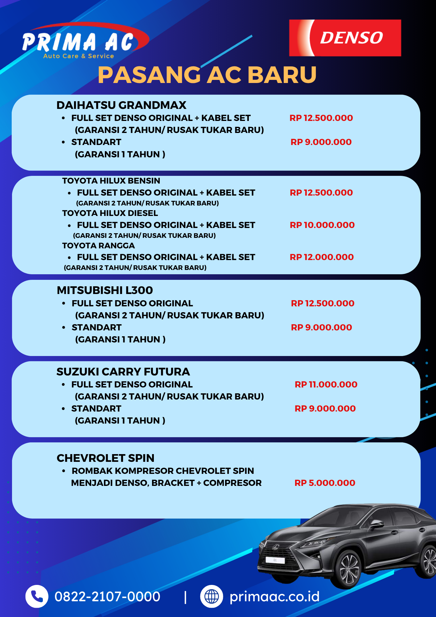 Tersedia paket pemasangan AC baru untuk berbagai jenis mobil, baik mobil yang belum ada AC maupun yang ingin ganti total sistem AC.